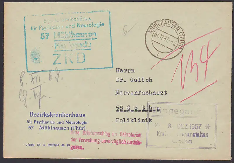 Mühlhausen R5 ZKD-St. in Grün statt violett, 7.12.67 Bezikskrankenhaus mit rotem Z3 Bitte Umschlag an Sekretatiat