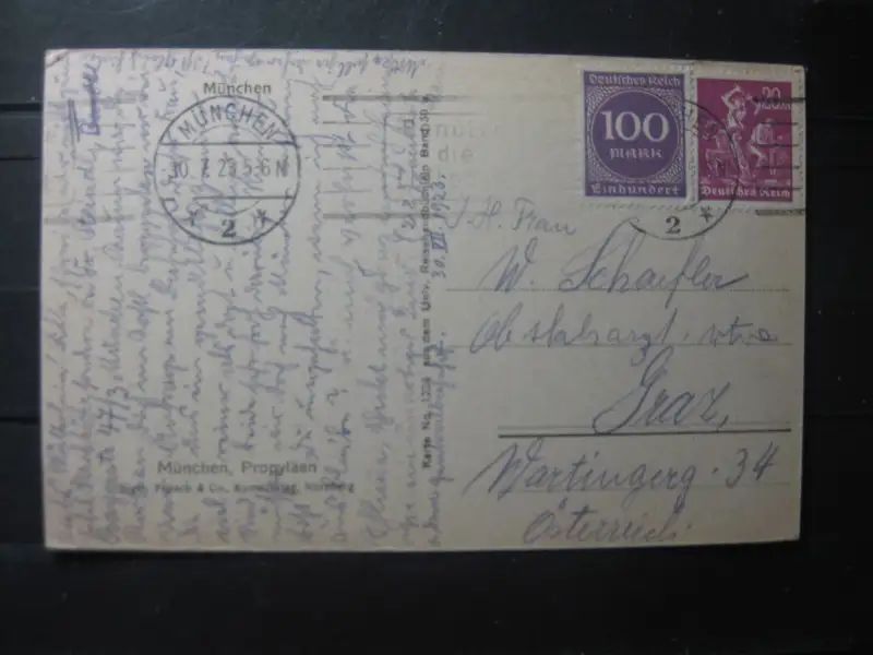 ca. 1923; Unschärfen, Spiegelungen, Verbiegungen, Verwerfungen sind allein durch das abfotografieren bedingt; Karte ist beidseitig abgebildet, Erhalt siehe Scan; ist das Foto qualitativ nicht aussagekräftig genug, kann es besseres Foto angefordert werden. Rückgabe bei Karten ist generell ausgeschlossen.