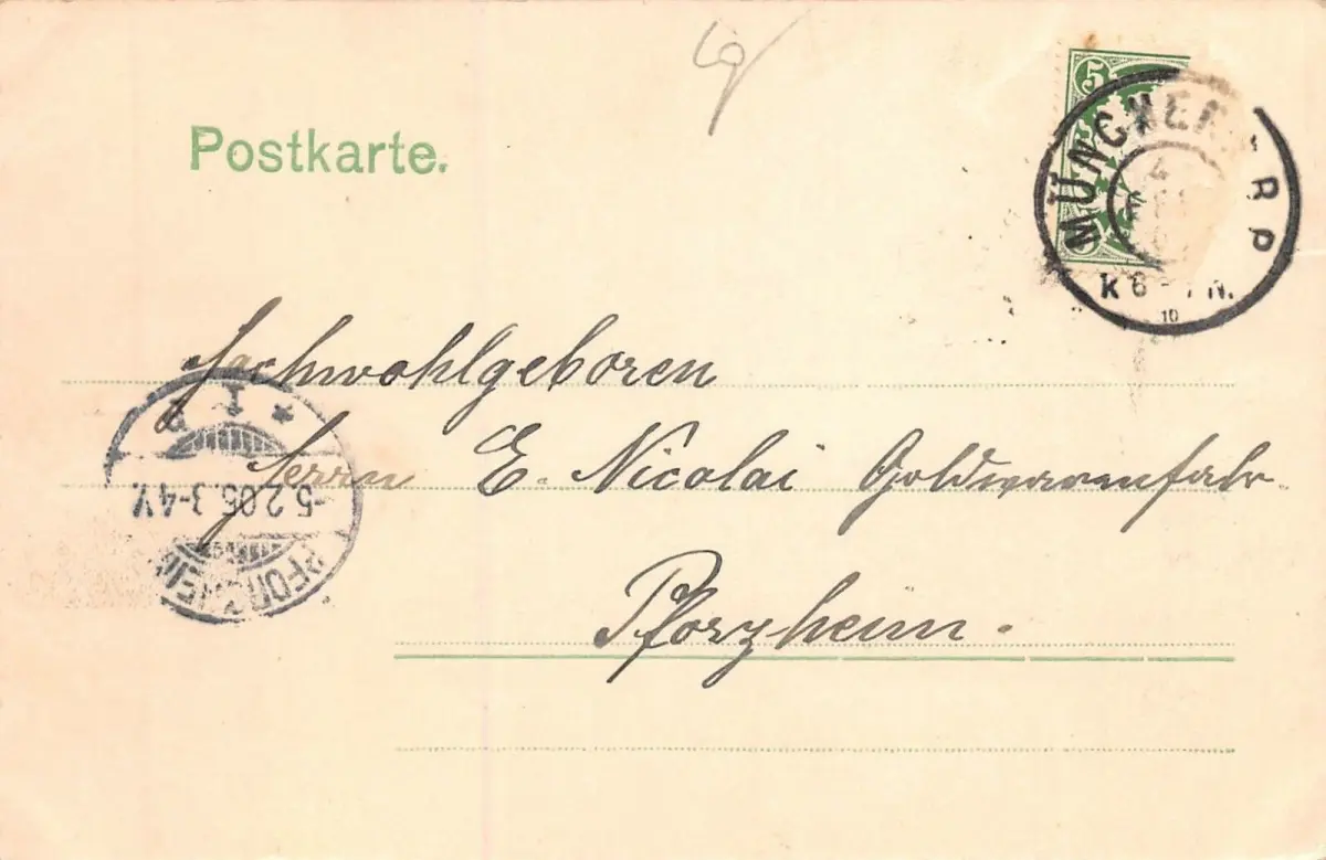 Rückseite: gelaufen 1905 von München nach Pforzheim