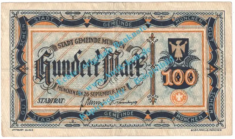 München , Notgeld 100 Mark Schein in gbr. Müller 3015.1.a , Bayern 1922 Grossnotgeld Inflation