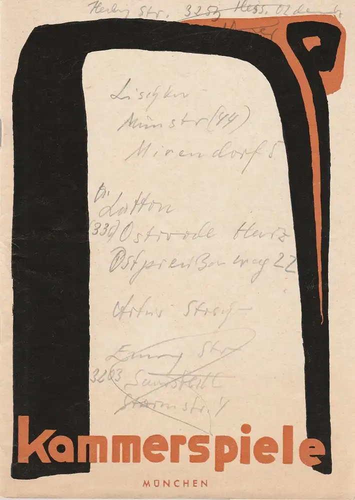 original Heft, nicht paginiert, ca. 20 Seiten, Szenenfotos zu : Joel Brand und Die Ermittlung, beiiegendes Heft ca. 12 Seiten, enthält u. a. Besetzungsliste vom 2. Dezember 1965 und Szenenfotos zur Aufführung. Zustand: gut, Bleistiftnotitzen auf dem Deckel