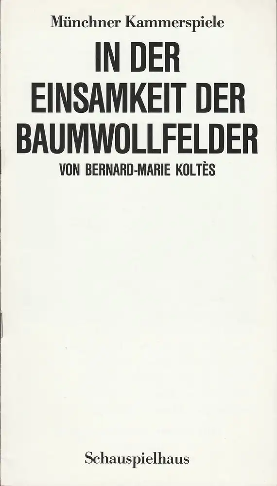 Münchner Kammerspiele, Dieter Dorn, Hans-Joachim Ruckhäberle: Programmheft Bernard-Marie Koltes IN DER EINSAMKEIT DER BAUMWOLLFELDER 20. Dezember 1987 Schauspielhaus Spielzeit 1987 / 88 Heft 3.