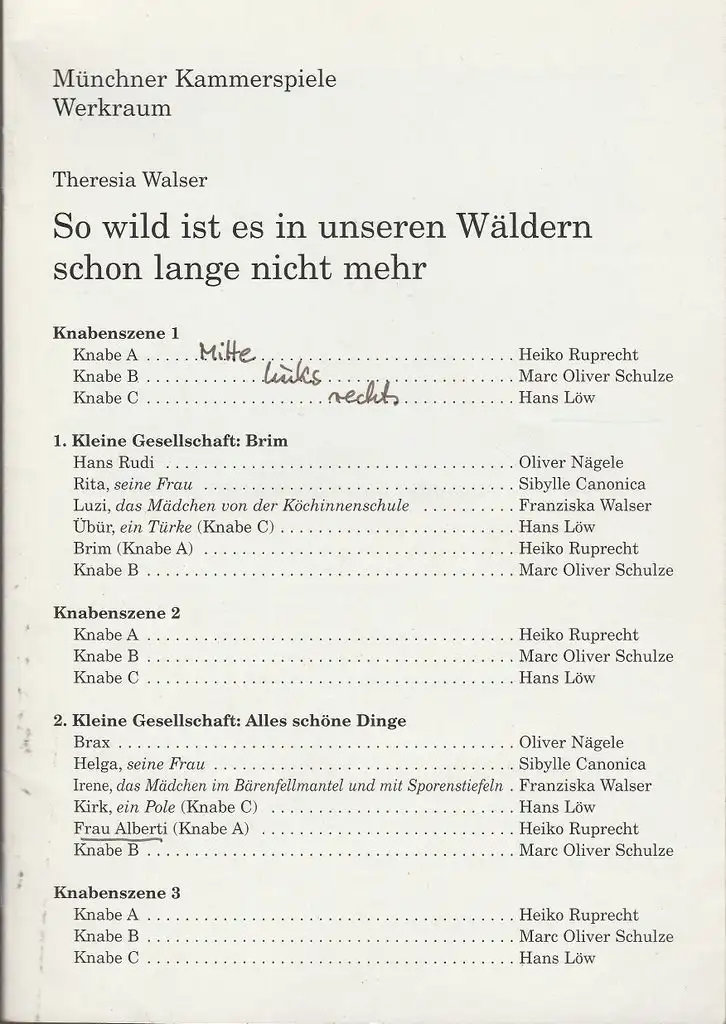 Münchner Kammerspiele, Dieter Dorn, Laura Olivi, Corina Zuber: Programmheft Uraufführung So wild ist es in unseren Wäldern schon lange nicht mehr von Theresia Walser 4. November 2000 Werkraum Spielzeit 2000 / 2001 Heft 2.