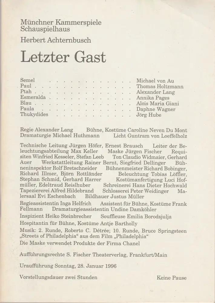 Regie: Alexander Lang. Bühne, Kostüme: Caroline Neven Du Mont. Mitwirkende: Michael von Au, Thomas Holtzmann, Alexander Lang, Annika Pages, Alois Maria Giani, Daphne Wagner, Jörg Hube - Theaterprogramm, Opernprogramm, Ballettprogramm, Musicalprogramm, Konzertprogramm, Theatermemorabilia, Programmhefte Sammlung, deutsche Theatergeschichte.