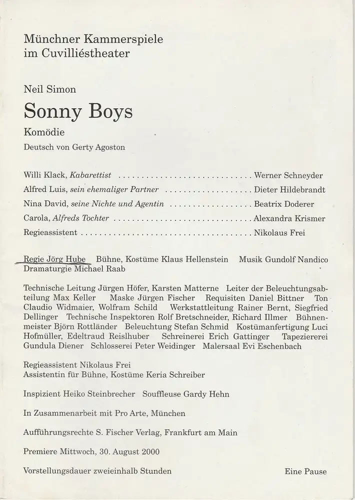 Münchner Kammerspiele, Dieter Dorn, Michael Raab: Programmheft Sonny Boys. Komödie von Neil Simon. Premiere 30. August 2000 Cuvilliestheater Spielzeit 2000 / 2001 Heft 1.