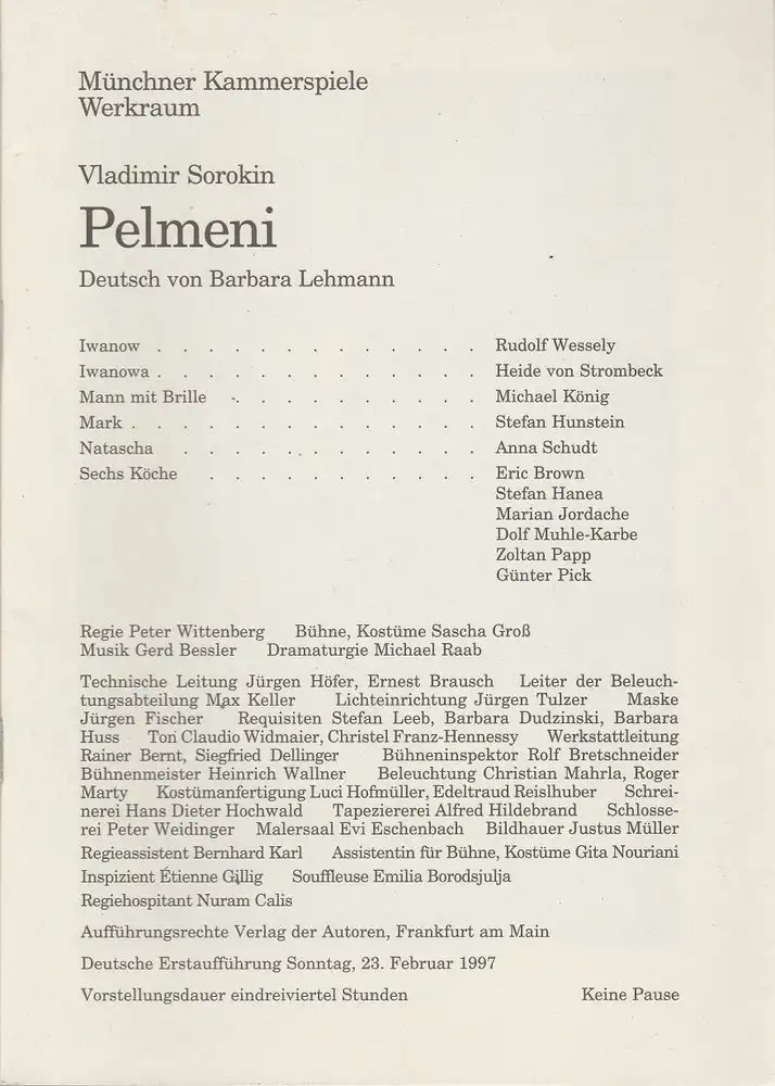 Münchner Kammerspiele, Dieter Dorn, Michael Wachsmann, Michael Huthmann, Michael Raab, Undine Damköhler: Programmheft Vladimir Sorokin PELMENI Premiere 23. Februar 1997 Werkraum Heft 2 Spielzeit 1996 / 97.