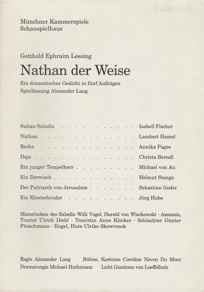 Regie: Alexander Lang. Darsteller: Isabell Fischer, Lambert Hamel, Annika Pages, Christa Berndl, Michael von Au, Helmut Stange, Sebastian Goder, Jörg Hube - Theaterprogramm, Opernprogramm, Ballettprogramm, Musicalprogramm, Konzertprogramm, Theatermemorabilia, Programmhefte Sammlung, deutsche Theatergeschichte.
