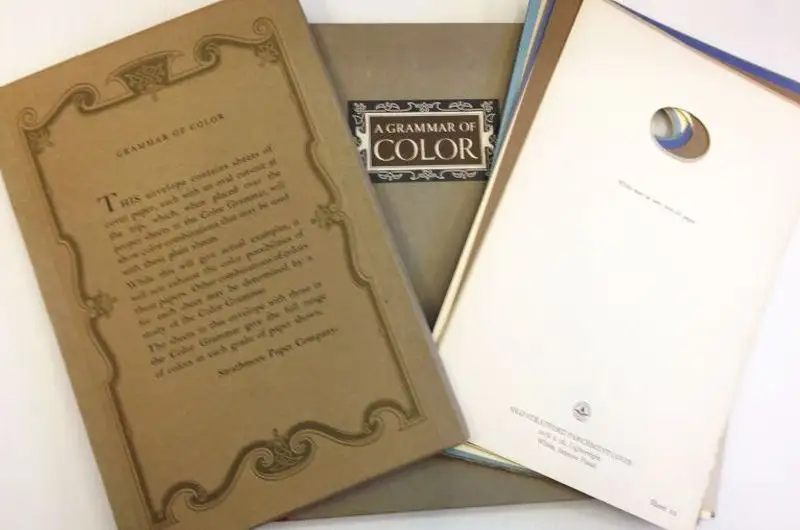 Titel: A Grammar of Color. Arrangements of Strathmore Papers. In a variety of printed color combinations according to The Munsell Color System with an introduction by Professor A. H. Munsell and explanatory text with diagrams illustrating the application of the System to work in the Graphic Arts by T. M. Cleland. 2 volumes