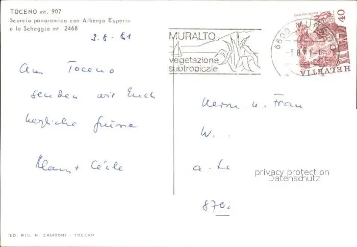 Muralto TI am Toceno Scorpio panoramico con Albergo Esperia e la Scheggia Muralto Locarno postalisch gelaufen 1981 Erhaltung siehe scans Alte Ansichtskarte Postkarte hz Woerer