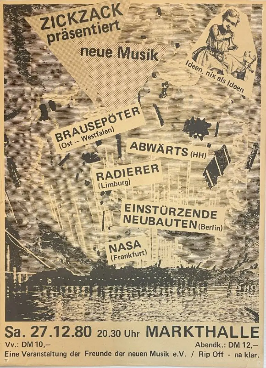 Veranstaltungsplakat "Sa. 27.12.80 20:30 Markthalle [Hamburg] / Eine Veranstaltung der Freunde der neuen Musik e.V. / von Rip Off - klar." Freunde der neuen Musik e.V. - Das hamburger Plattenlabel Zickzack Records wurde 1980 von dem Musikjournalisten und Labelbetreiber Alfred Hilsberg (1947-2025) gegründet. Das Label profilierte sich seitdem vor allem im Rahmen der Neuen Deutschen Welle, ein Begriff, den Hilsberg in seinem Sounds-Artikel "Neue Deutsche Welle – Aus grauer Städte Mauern" prägte. Seitdem war das Label Plattform für viele deutsche Independent-Bands und es förderte Anfang der 1990er Jahre unter anderem Blumfeld und andere zentrale Bands der Hamburger Schule. - Insgesamt etwas gebräunt und minimal wellig. Kleinere Randläsuren. Im unteren Randbereich vier Einrisse fachmännisch hinterlegt