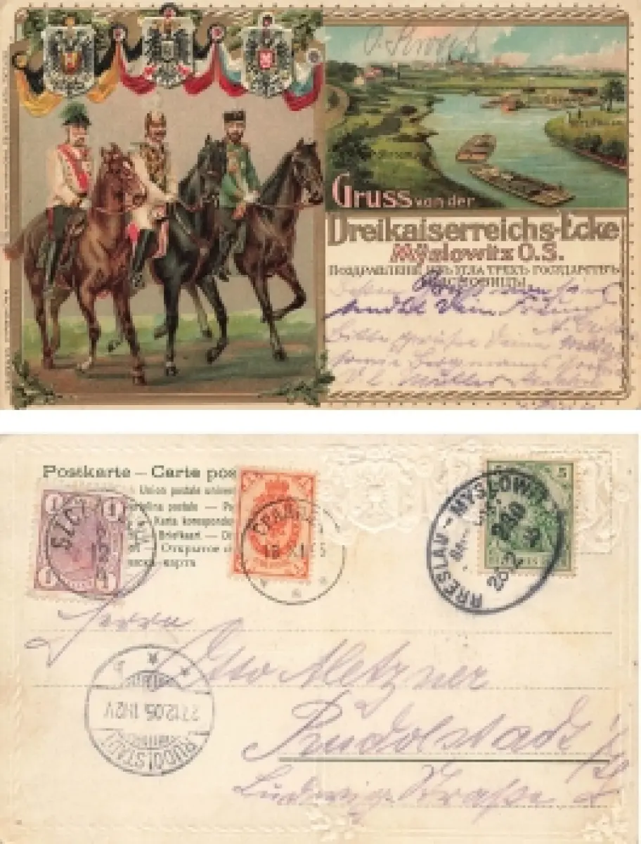 Myslowitz Oberschlesien Dreikaiserreichs-Ecke Prägelitho Myslowice Bahnpost Breslau Myslowitz Zug 230 o 1905