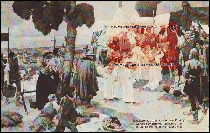 • MichSeite NBKD: MiNr. 15 Block 2, 01.06.2012, "Naumburger Kirschfest 2012", Satz, postfrisch Beschreibung \nPostdienstleister: Naumburger Brief Kurier Dienst, Naumburg \nAusgabeanlass: Briefmarkenausgabe "Naumburger Kirschfest 2012" Katalognummer: MiNr. 15 Block 2 Ausgabedatum: 01.06.2012 Nominale: Satz (1 Wert, Block) zu 1,05 EUR \nTyp: - \nErhaltung: selbstklebend, geschnitten, postfrisch \nHinweis: - Thema: Kinder vor Prokop, Realgymnasium Naumburg (Humboltschule)