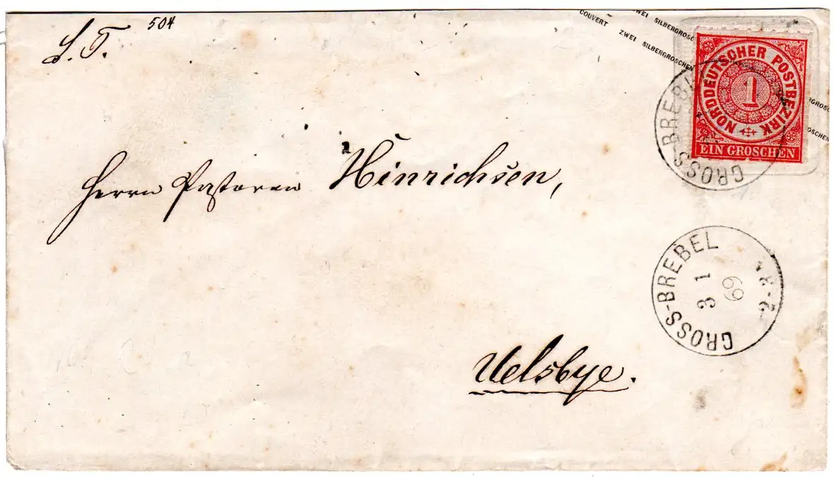 NDP 1869, K1 Gross-Brebel auf 1 Gr./Preussen 2 SGr Ganzsachenumschlag n. Uelsbye