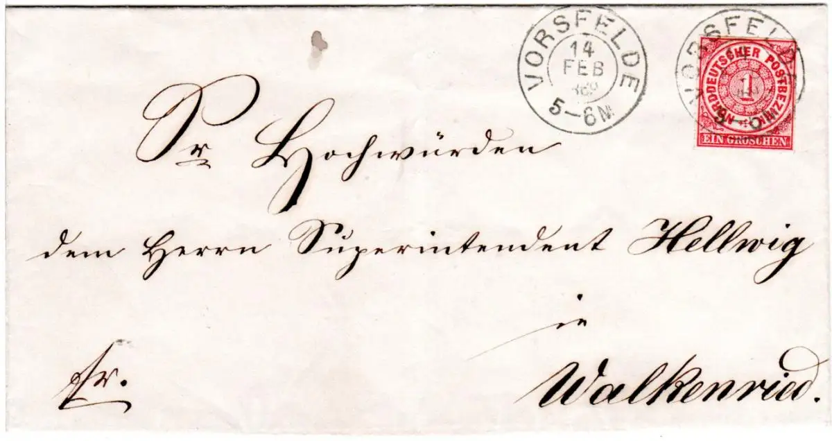 NDP 1869, nachverwendeter Braunschweig-K2 VORSFELDE klar auf Brief m. 1 Gr.