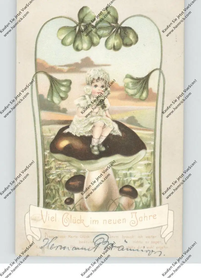 NEUJAHR - PROSIT NEUJAHR, Mädchen auf Pilz (Mushroom/Champignon/Funghi) sitzend, Präge-Karte
