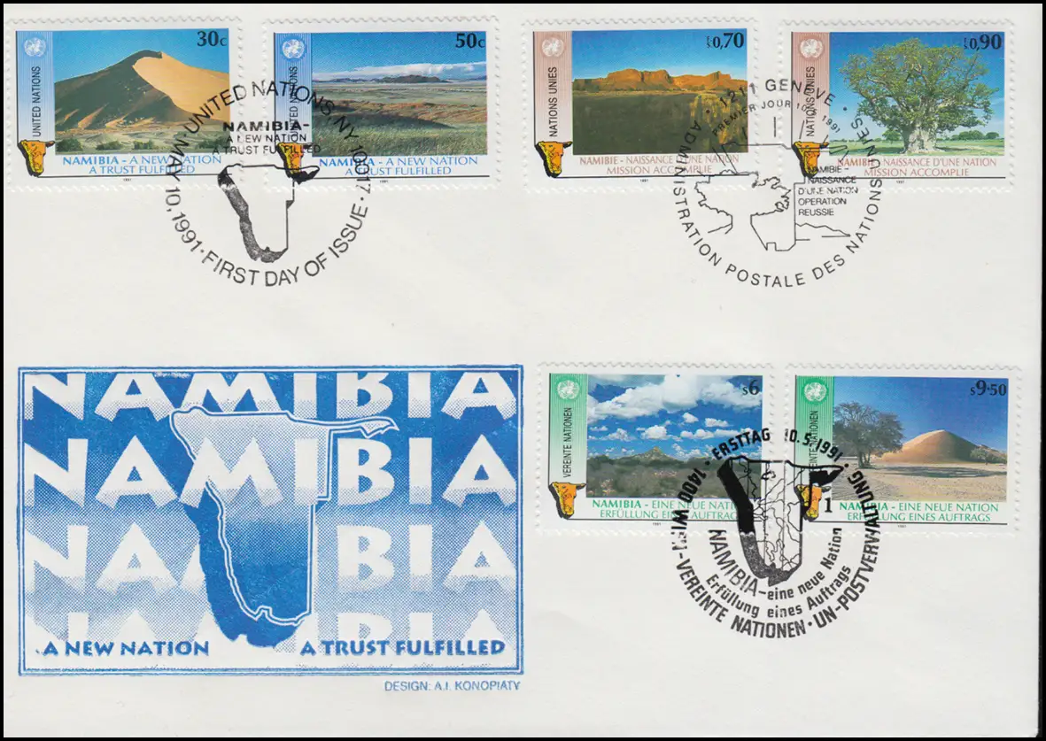 Namibia: Eine neue Nation - Schmuck-FDC der 3 UNO-Ausgaben 10.5.1991