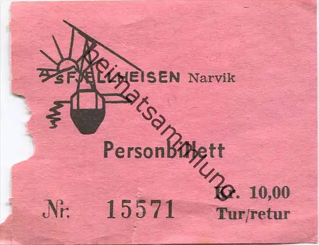 Narvik A/S Fjellheisen - Luftseilbahn - Personbillett - Fahrschein Kr. 10,00