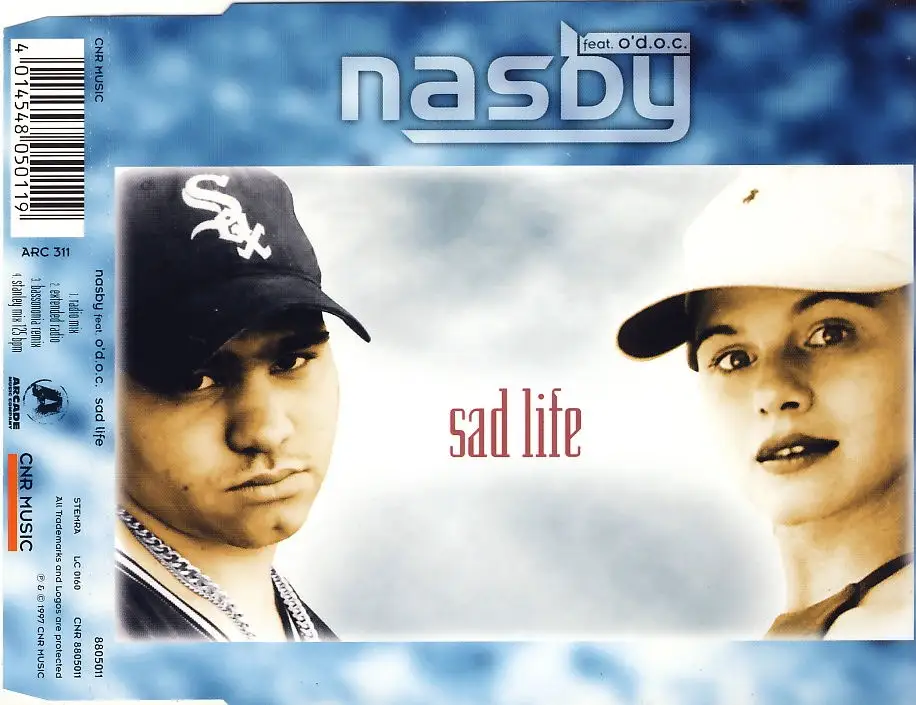 CD Single Nasby feat. O'D.O.C. - Sad Life, incl. German Info-Sheet, Zustand CD M- Hülle M-; Made in Netherlands 1997 CNR Records 8805011, Tracks Radio Mix 3:49, Ext. Radio 5:33, Bassononia Mix 4:00, Stanley 125 BPM Mix 7:46
