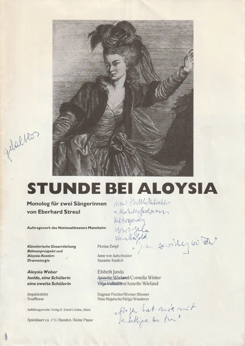Monolog für zwei Sängerinnen. Auftragswerk des Nationaltheaters Mannheim. Künstlerische Gesamtleitung: Florian Zwipf. Bühnenprospekt und Aloysia-Kostüm: Anne von Aufschnaiter. Mitwirkende: Elsbeth Janda, Annette Wieland / Cornelia Winter, Vilja Valkainen - Theaterprogramm, Opernprogramm, Ballettprogramm, Musicalprogramm, Konzertprogramm, Theatermemorabilia, Programmhefte Sammlung, deutsche Theatergeschichte.