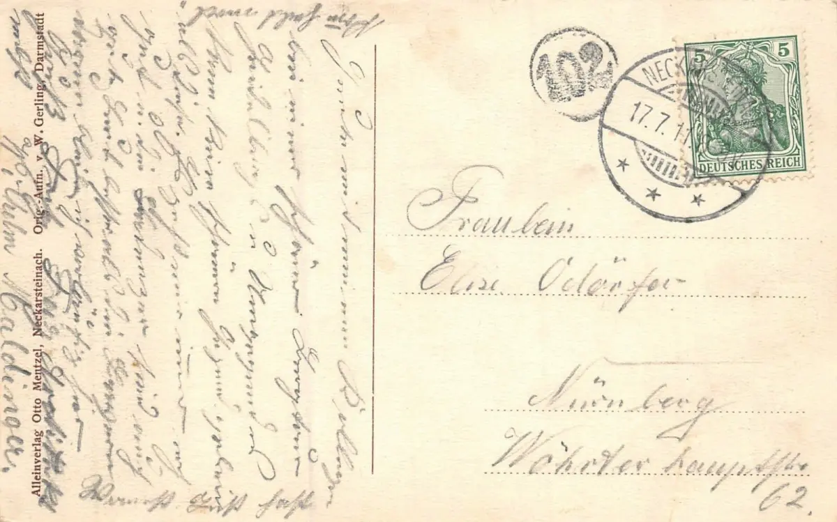 Rückseite: gelaufen 1911 von Neckarsteinach