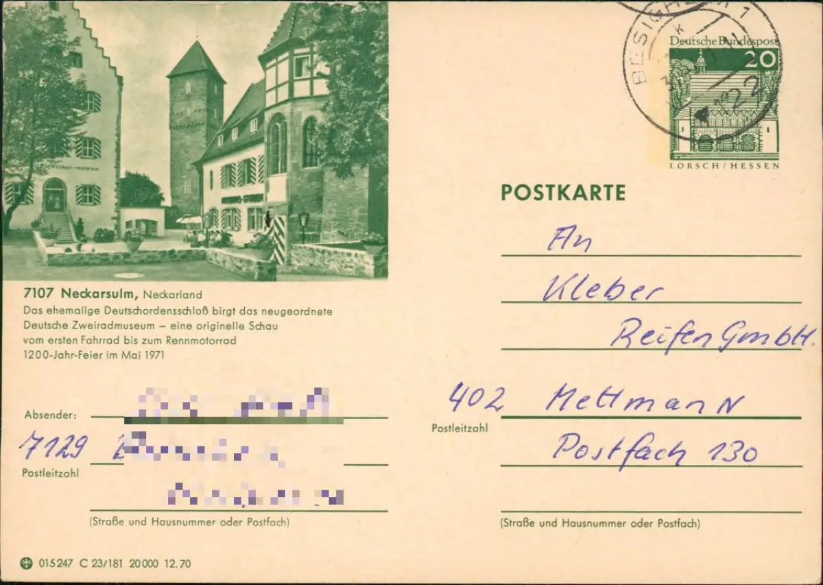 Neckarsulm Ganzsache 015247 C 23/181 20 000 12.70 LORSCH/HESSEN 1971