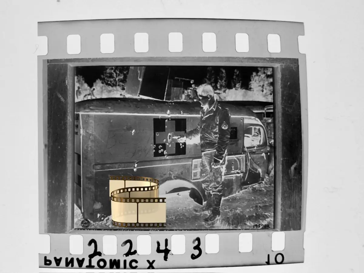 Negativ 4x3,5cm - Militärfahrzeug Soldat zeigt auf sichtbare Einschuss-Löcher