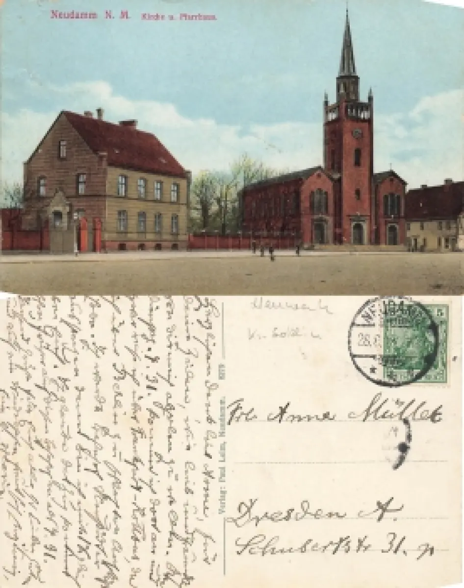 Neudamm Neumark Kirche mit Pfarrhaus Debno o 28.8.1915