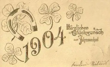 Neujahr 1904, Glückshufeisen, Kleeblatt, Prägekarte gestempelt
