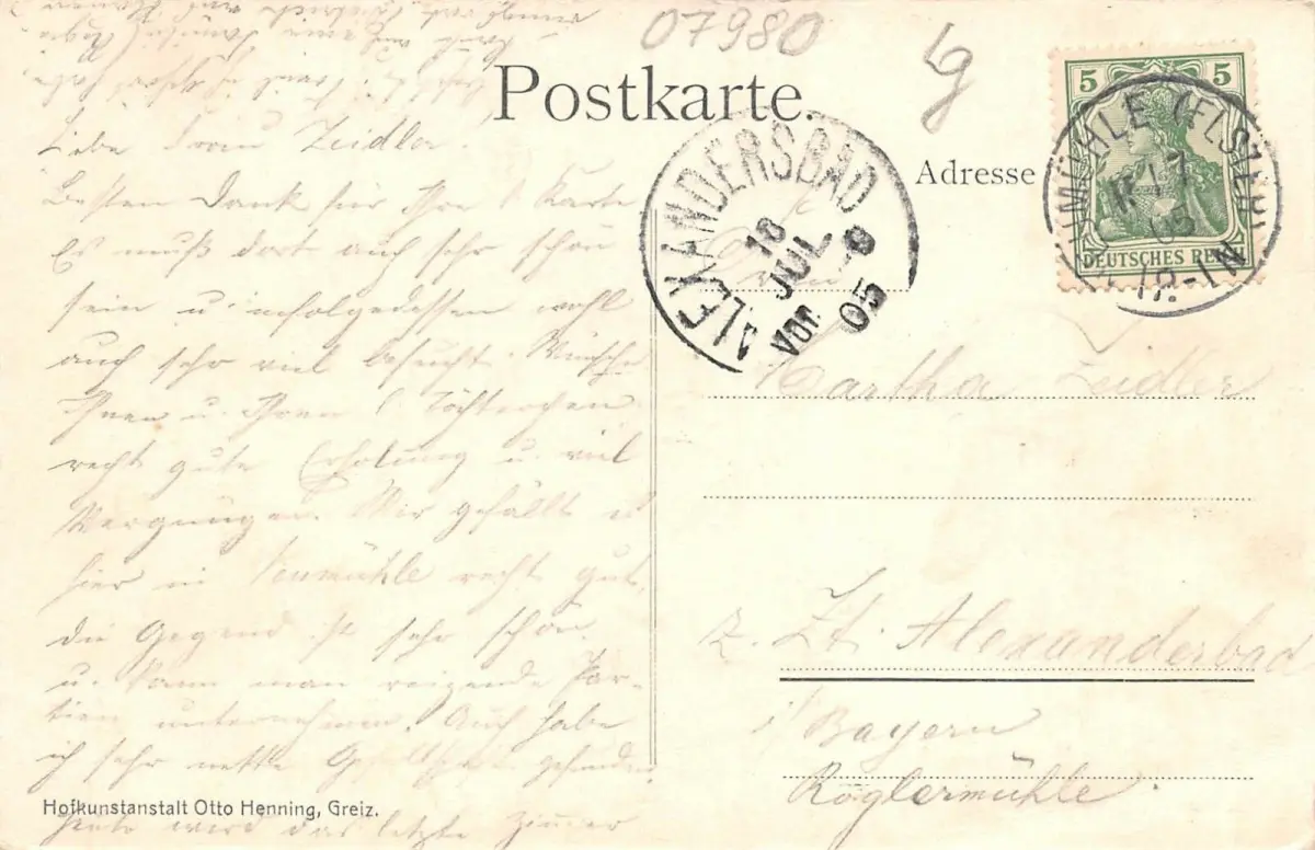 Rückseite: gelaufen 1905 von Neumühle (Elster) nach Alexandersbad