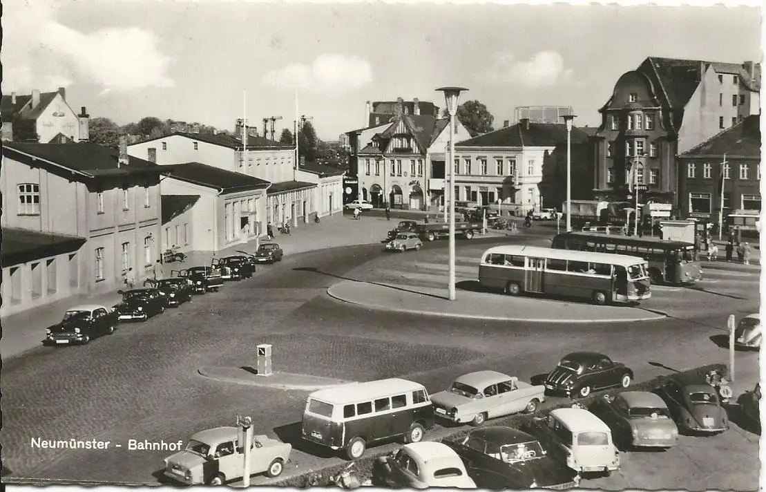Neumünster Bahnhof, gebr. sw AK m. Autos u. Bus