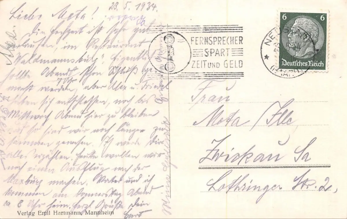 Rückseite: gelaufen 1934 von Neustadt (Haardt)