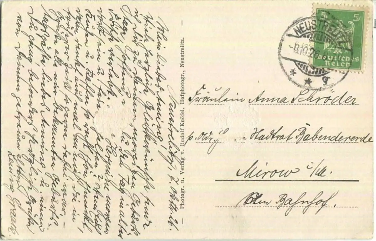 Neustrelitz - Schloss - Verlag Rudolf Knöfel Neustrelitz - rückseitig Klebespuren (G7013) gel. 1926