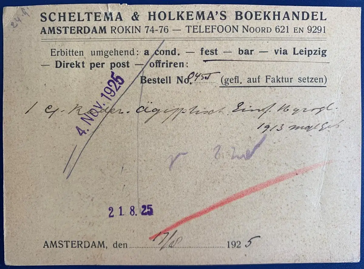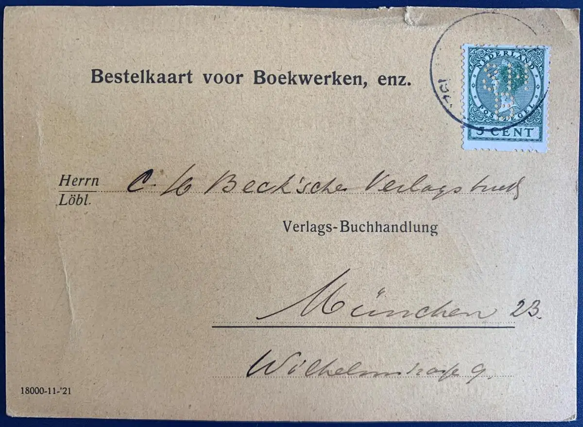 Bestelkaart voor Boekwerken, gelaufen mit Poststempel vom 17.08.1925 von Amsterdam nach München, Karte hat Firmenaufdruck auf der Rückseite, kleiner Einriß Oberkante, ansonsten gute Erhaltung.