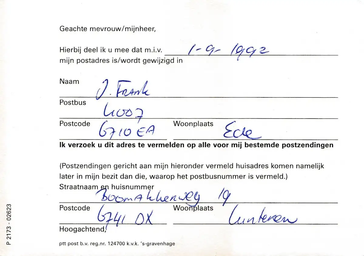 Niederlande: 1992: Wijziging postadres