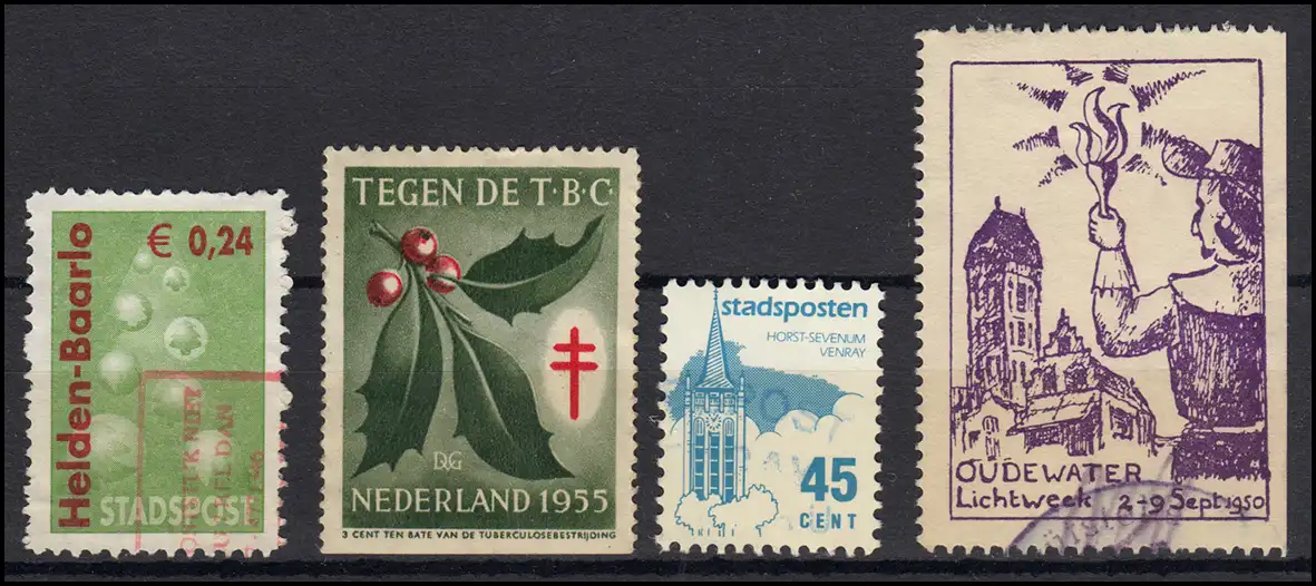 Stadpost Helden-Baarlo, TBC-Spenden-Marke, Stadposten-Marke von Venray, Vignette Oudewater Lichtweek September 1950