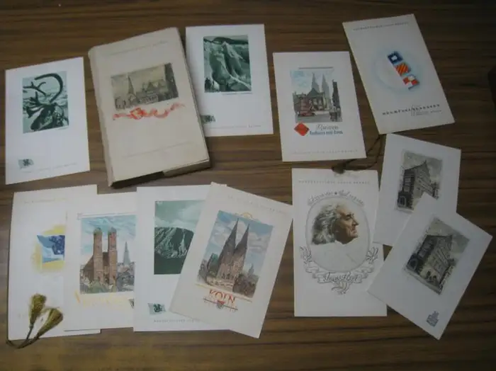 Verschiedene Formate von A6 bis A4 in Pappmappe mit farbiger Deckelillustration (Rathaus und Marktplatz Bremen). Die Pappmappe angeschmutzt, Buchrücken mit starker Knickspur und 3 hinterlegten Einrissen. Innenliegend eine Postkarte mit farbiger Abbildung der 'Stuttgart'; 11 Speisekarten teils mit Kordelbindung, zumeist mit farbiger Deckelillustration; 1 Ausgabe der Ocean-Zeitung (Offizielle Bordzeitung des NLB); eine Einladungskarte zu einem Kurzvortrag an Bord; eine Ausgabe der 'Leuchtboje'; eine Einladungskarte zum Bordfest Hochsee-Zinnober sowie zwei Doppelblätter jeweils mit Karte, Informationen und Spaziergangsvorschlägen für Balholm sowie für Bergen. Die Beilagen alle gut und sauber erhalten