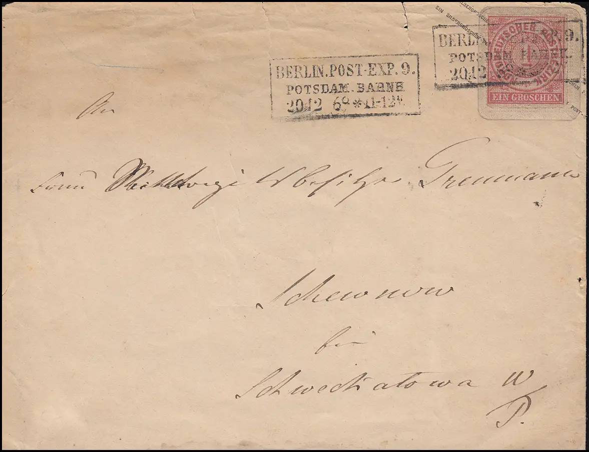 nach Schewno bei Schwekatowo / Westpreußen mit Ausgabestempel 22.12., echter Bedarf, Mängel (Klappe fehlt, oben kleine Einrisse)