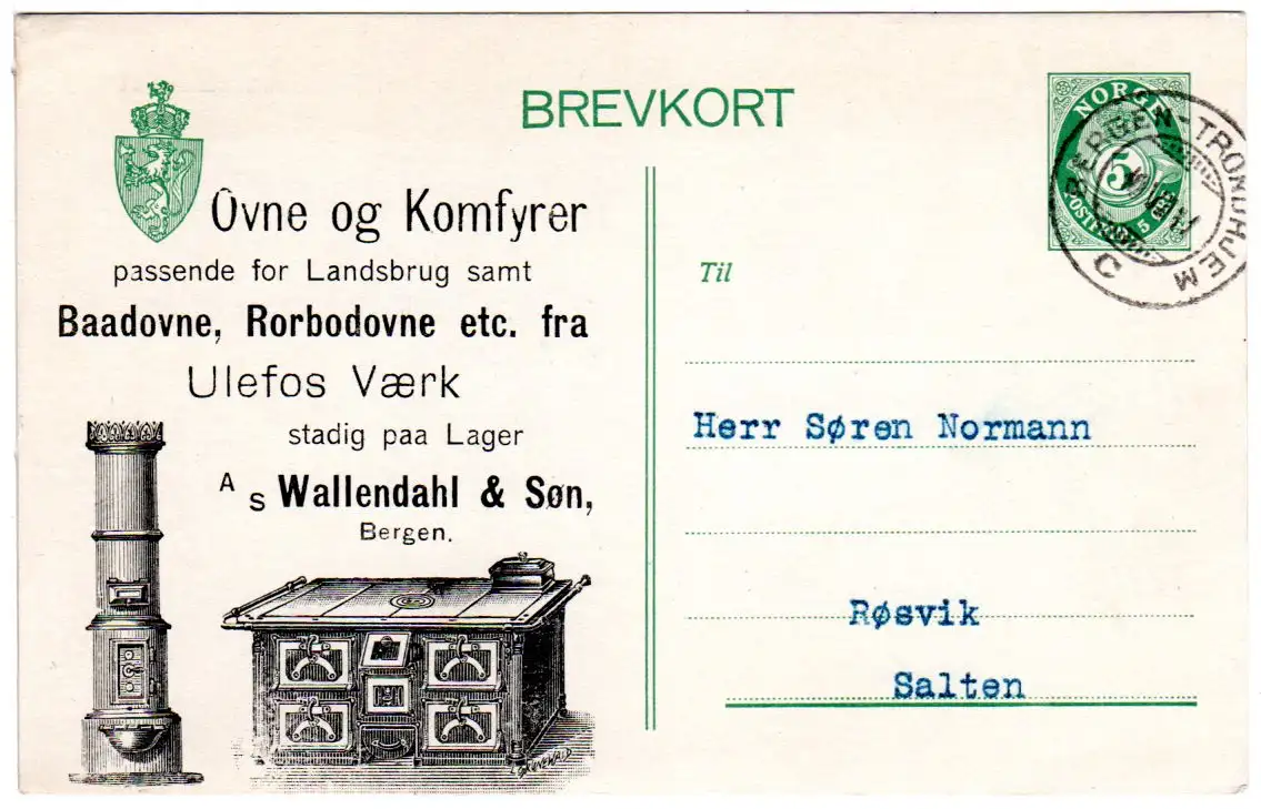 Schiffspost Stempel Bergen-Trondhjem C auf Ganzsachenkarte m. illustriertem Reklame-Zudruck Ovne og Komfyrer... fra Ulefos Vaerk..., A/S Wallendahl & Son. Interessant auch f. Thematik Motiv Heizung, Energie etc.