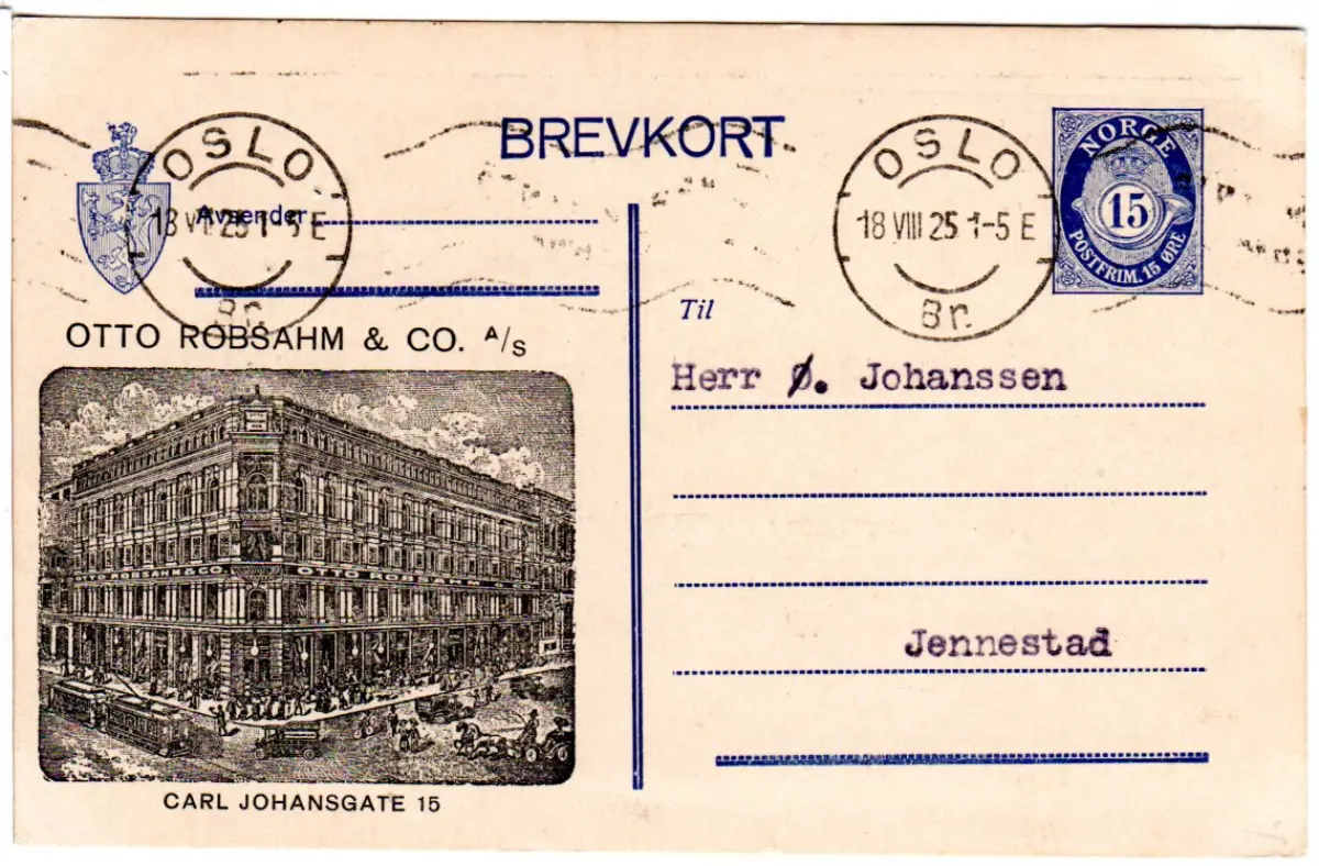 Norwegen 1925, 15 öre Ganzsache v. Oslo m. Zudruck O. Robsahm & Co. m. Trambahn