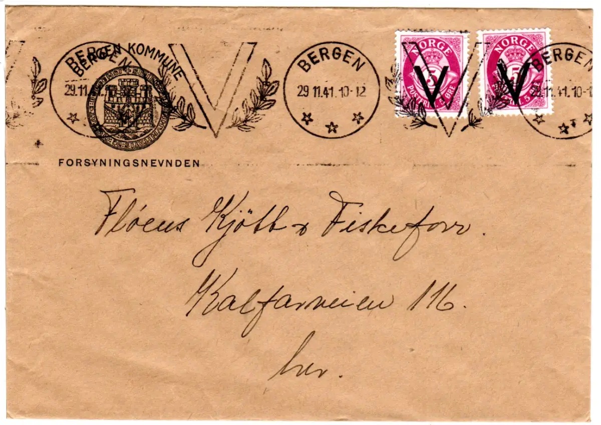 Norwegen 1941, 2x5 öre V-Überdruck auf Orts-Brief m. Bergen V-Maschinenstpl.