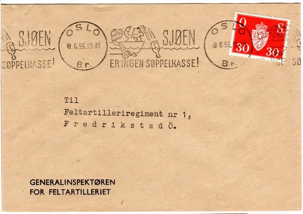 Sjöen er ingen Söppelkasse (das Meer ist keine Mülltonne), früher Naturschutz Maschinenwerbestempel v. Oslo m. Abb. von Müll ins Meer werfenden Menschen. Klar auf Militärbrief m. 30 öre Dienstmarke. Interessant f. Thematik Motiv Natur, Umwelt, Naturschutz etc.