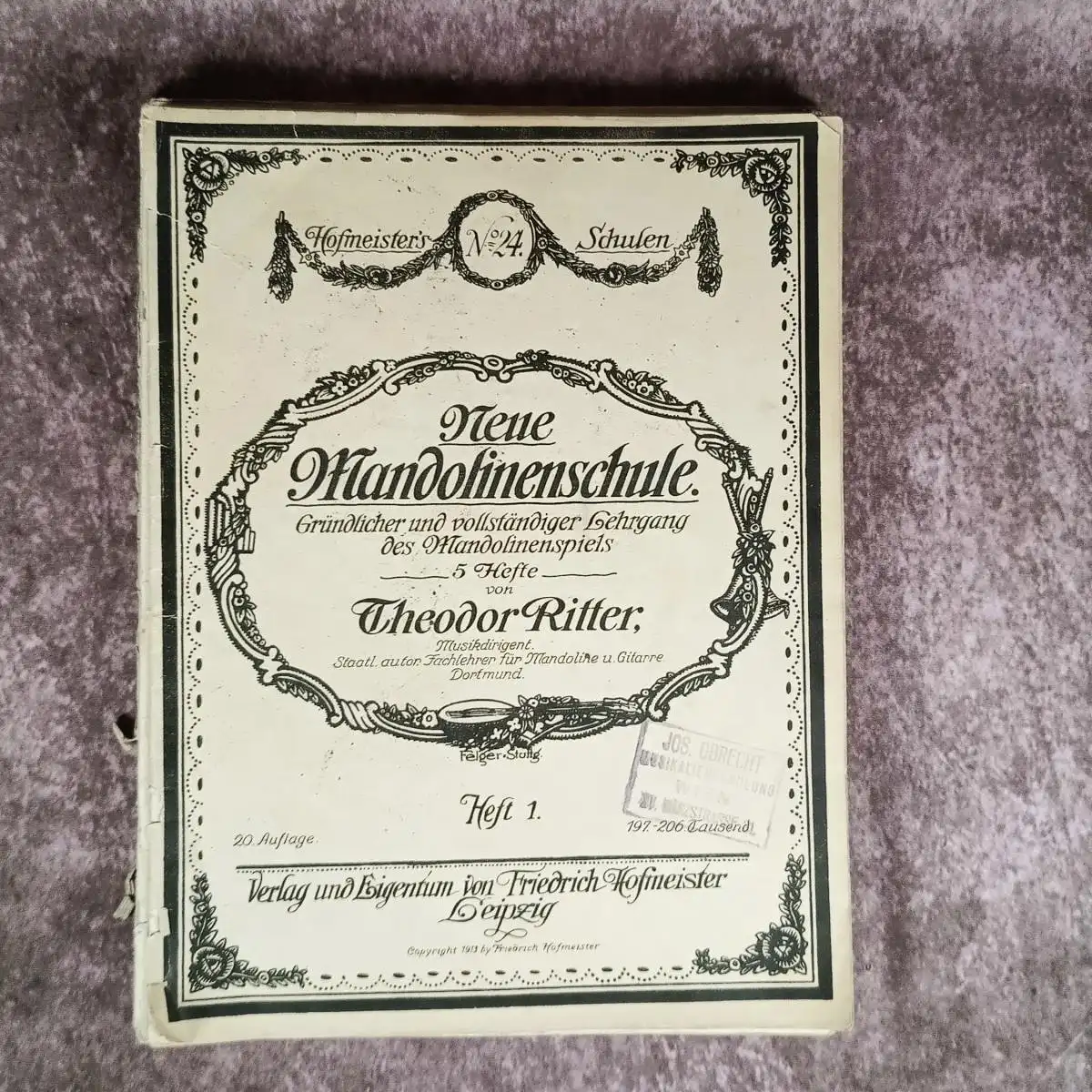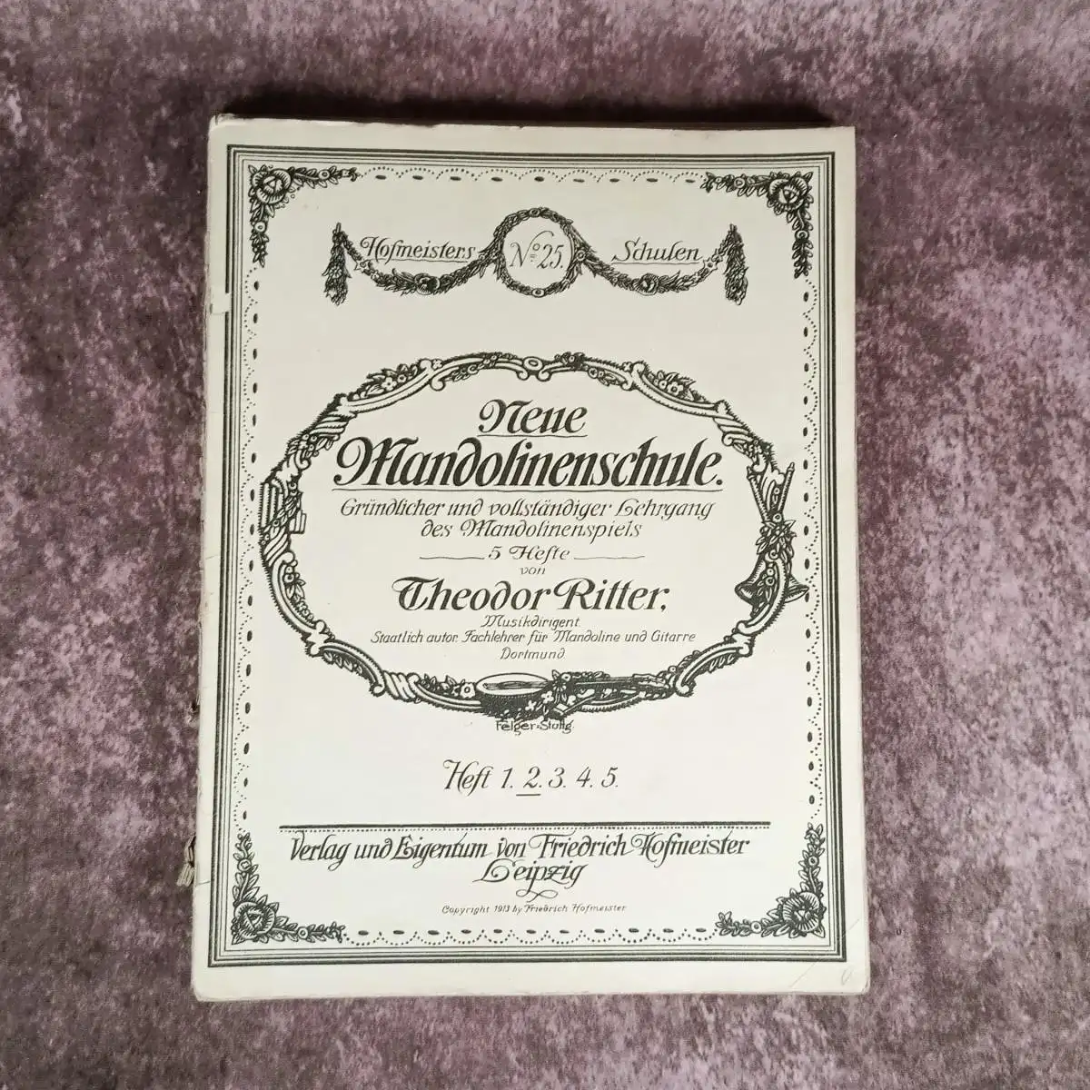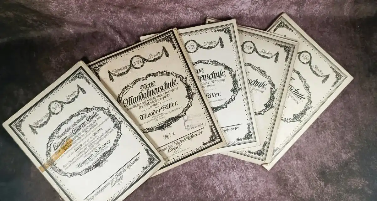 Set aus fünf antiken Notenheften für Mandoline und Gitarre. Enthält „Neue Mandolinenschule“ von Theodor Ritter (1913-1915, 4 von 5 Ausgaben) mit Illustrationen, Notenbeispielen und Anleitungen für Anfänger und Fortgeschrittene sowie „Kurzgefasste, volkstümliche Lauten und Gitarre Schule“ von Heinrich Scherrer (1911) mit Übungen, Melodien und Techniken. Guter Zustand mit geringen Altersspuren. Ideal für Sammler historischer Musikliteratur oder Musiker mit Interesse an traditioneller Spielweise.