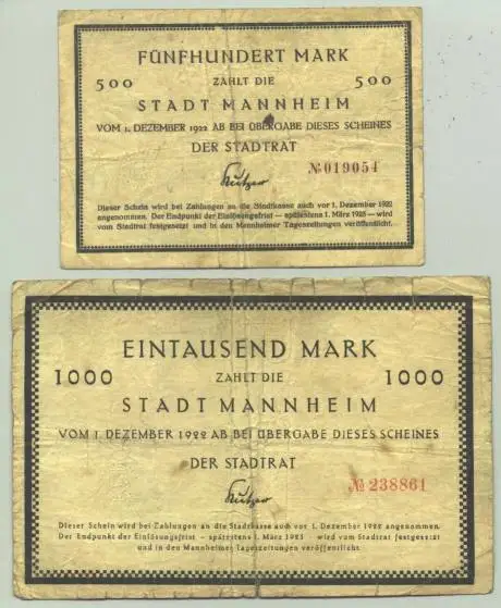 Notg. 2x MA 1922 (intern : 0080607) Artikelbeschreibung u. Zustand : Siehe Scan / stark gebraucht. Weitere Infos : 2 alte Geldscheine, die vielleicht auch fuer den Heimatsammler interessant sind ? 500,00 Mark u. 1.000,00 Mark Mannheim 1922. PLZ-Bereich pauschal 68163