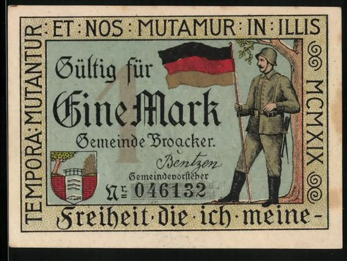 Notgeld Broacker 1919, 1 Mark, Soldat mit Fahne und Segelboot, Seriennr. 046132, Wappen