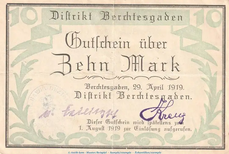 Gutschein / Banknote über Zehn Mark , Distrikt Berchtesgaden , GroßnotgeldBundesland : Bayern  ,  Geiger : 038.04