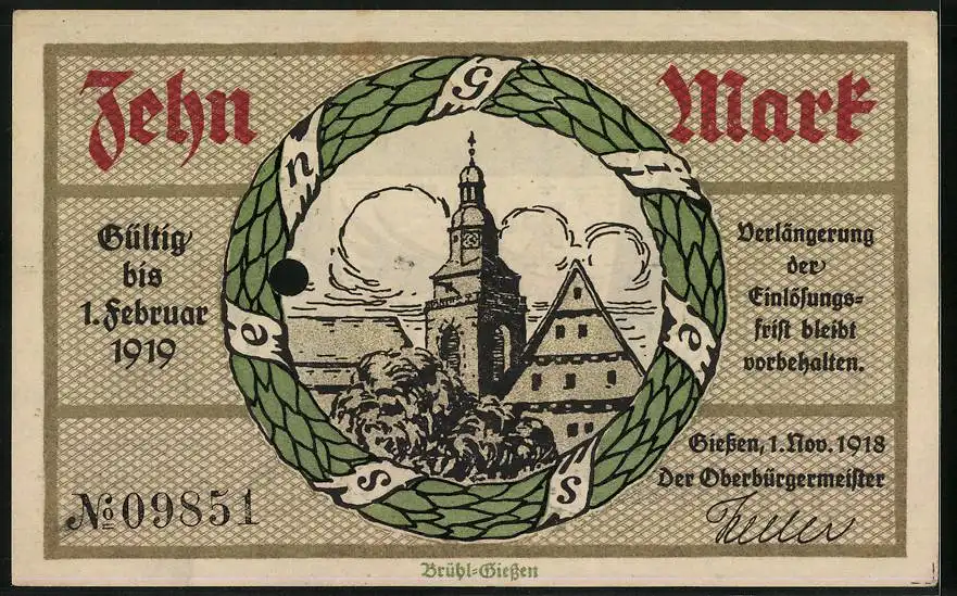 Notgeld Giessen 1918, 10 Mark, Wappen im Kranz, Ortspartie mit Kirchturm