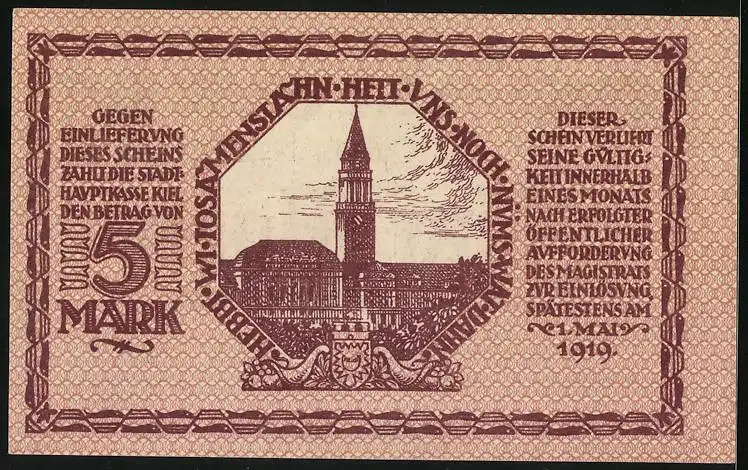 Notgeld Kiel 1918, 5 Mark, Rathaus, Wappen
