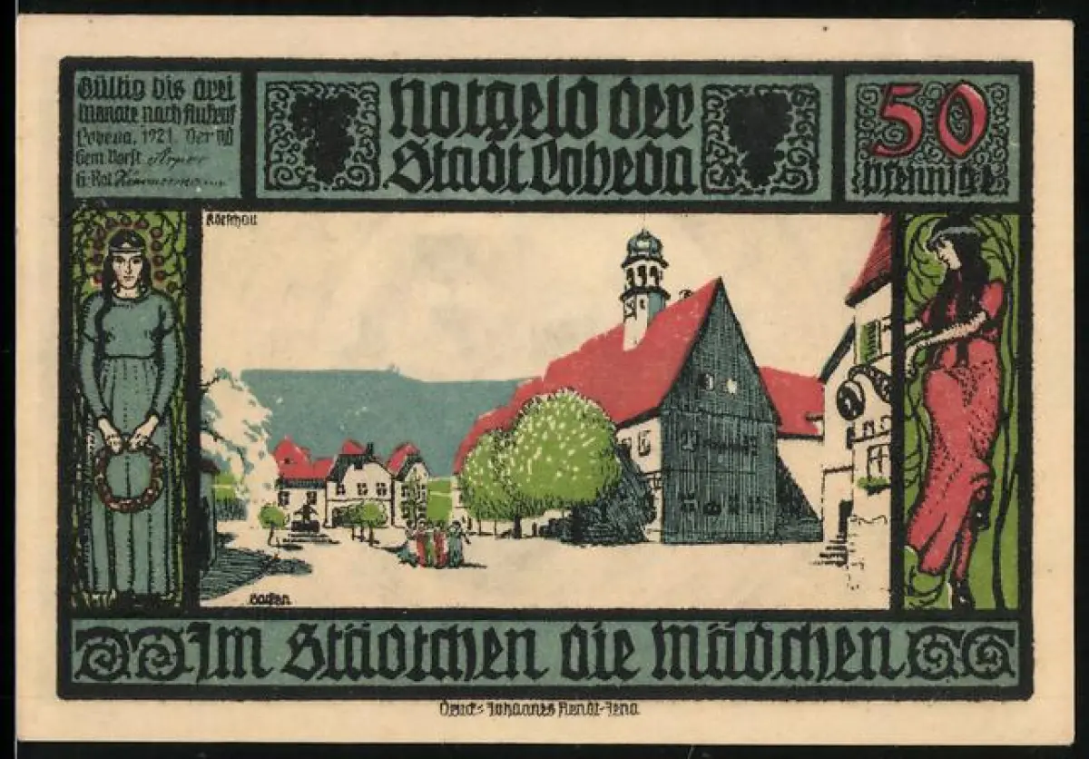 Notgeld Lobeda 1921, 50 Pfennig, Ortsansicht und Ruine mit Ritter