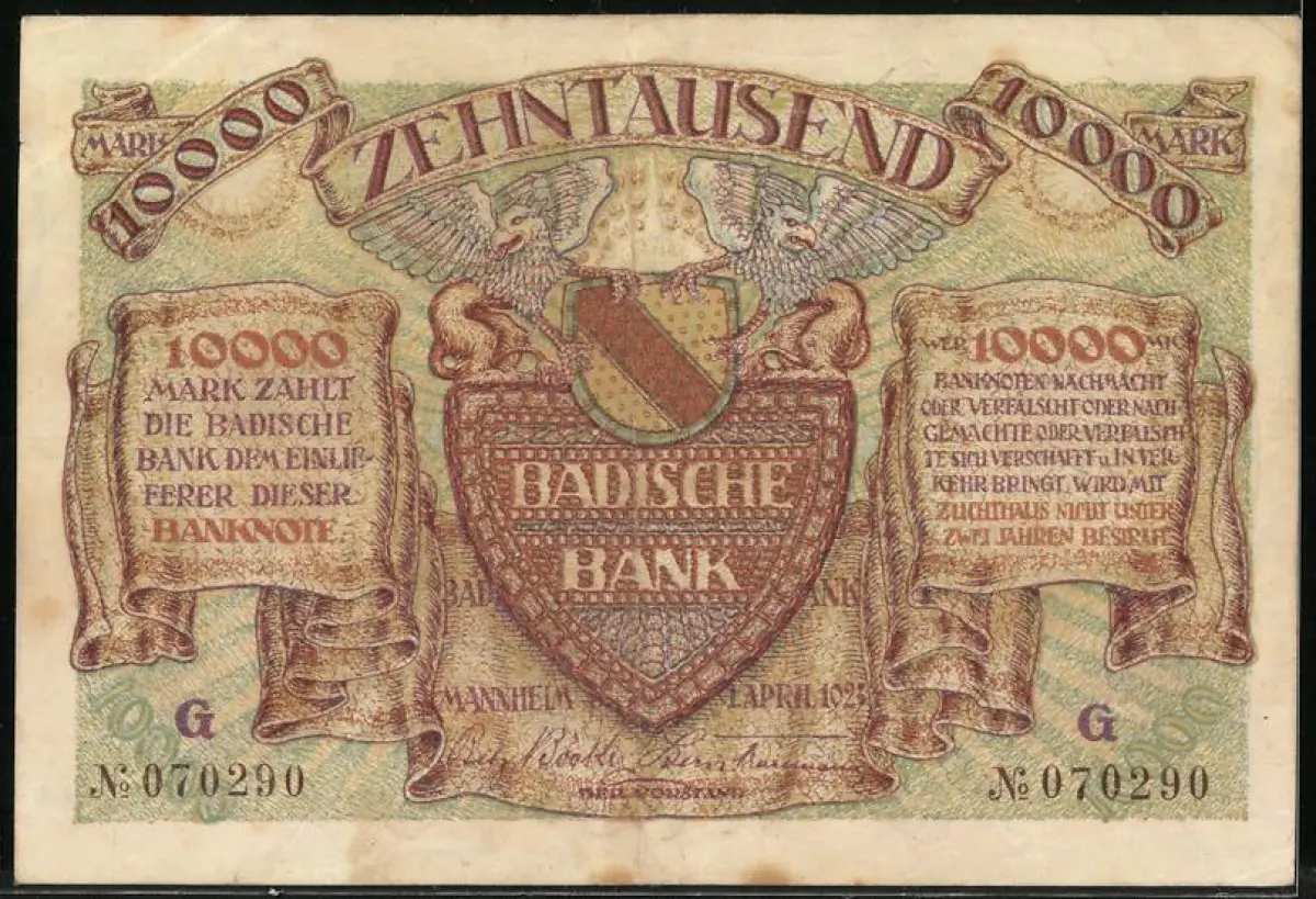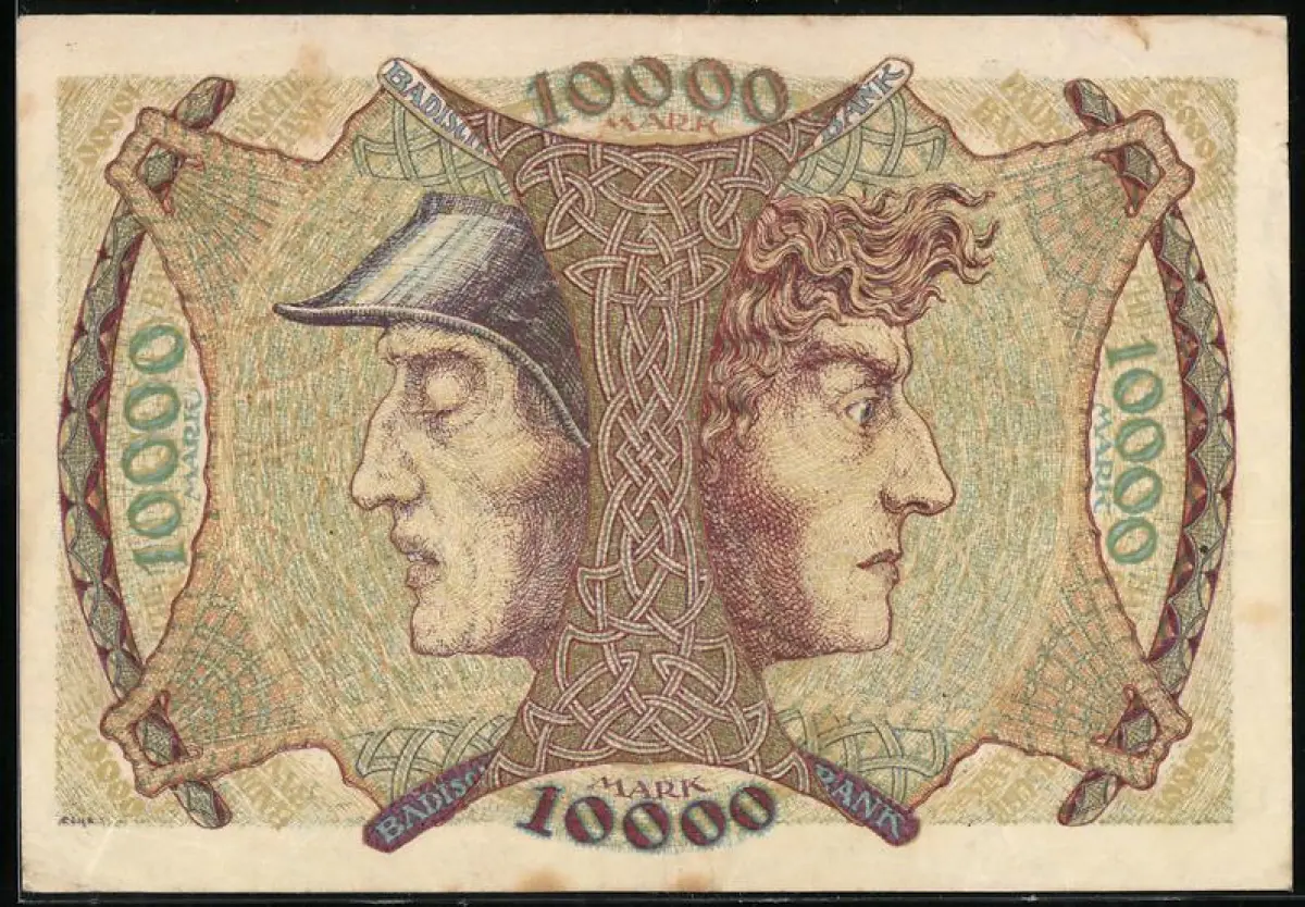 Notgeld Mannheim 1923, 10.000 Mark, Heldenköpfe und Wappen der Badischen Bank