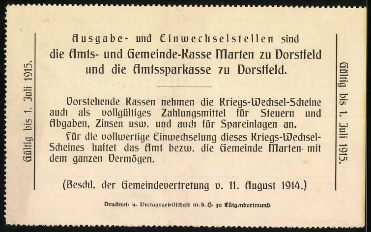 Notgeld Marten 1914, 1 Mark, Kriegs-Wechsel-Schein mit rot-schwarzem Text und Garantieerklärung